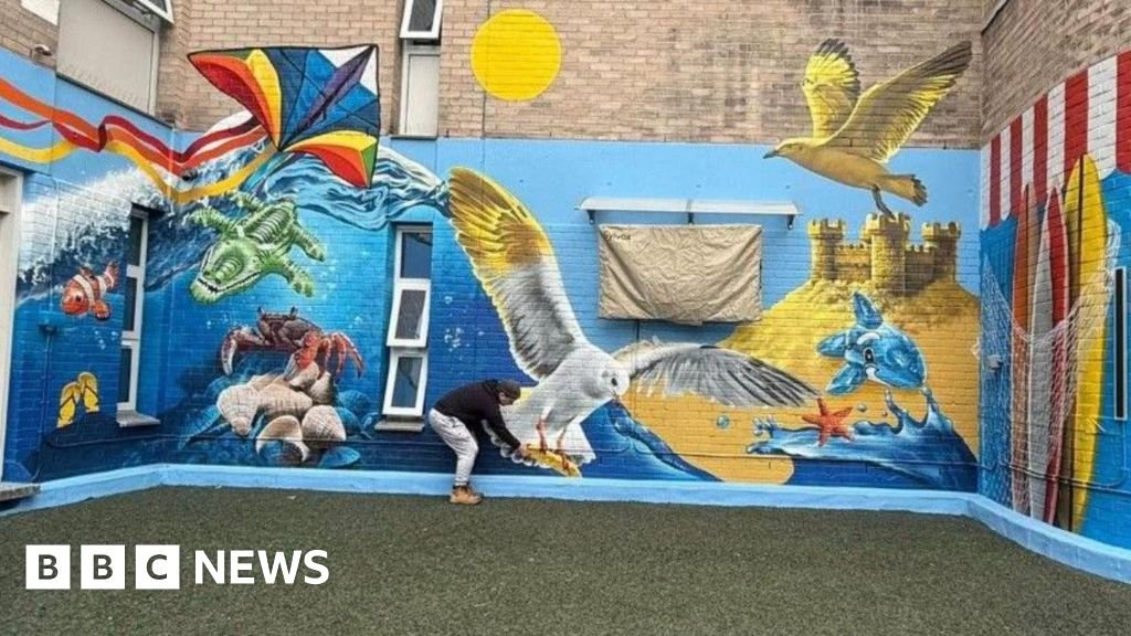 Birmingham artist Mr Murals’ latest piece, on display in a children’s garden at New Cross Hospital in Wolverhampton, depicts a seaside-theme, with seagulls, sandcastles and an array of creatures.