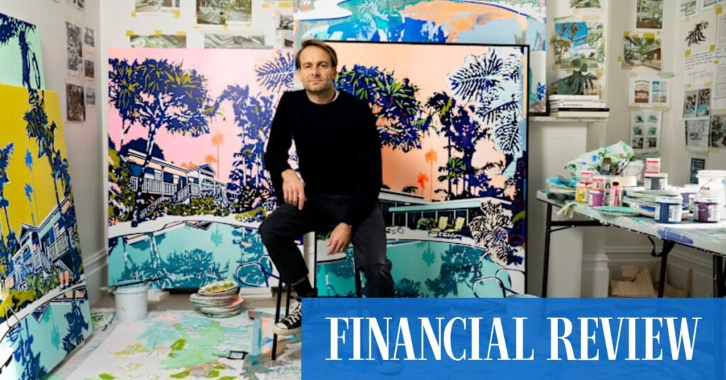 It’s a fitting location to be talking about Davies’ latest series of paintings, Constructed Realities, going on show at Jan Murphy Gallery in Brisbane later this month. There’s a dream-like intensity to the artist’s work – often featuring mid-century Californian homes drenched in summer light, curvilinear shapes, vertical lines, pastel colours, swimming pools and lush foliage. The houses in his paintings look familiar but at the same time quite surreal.