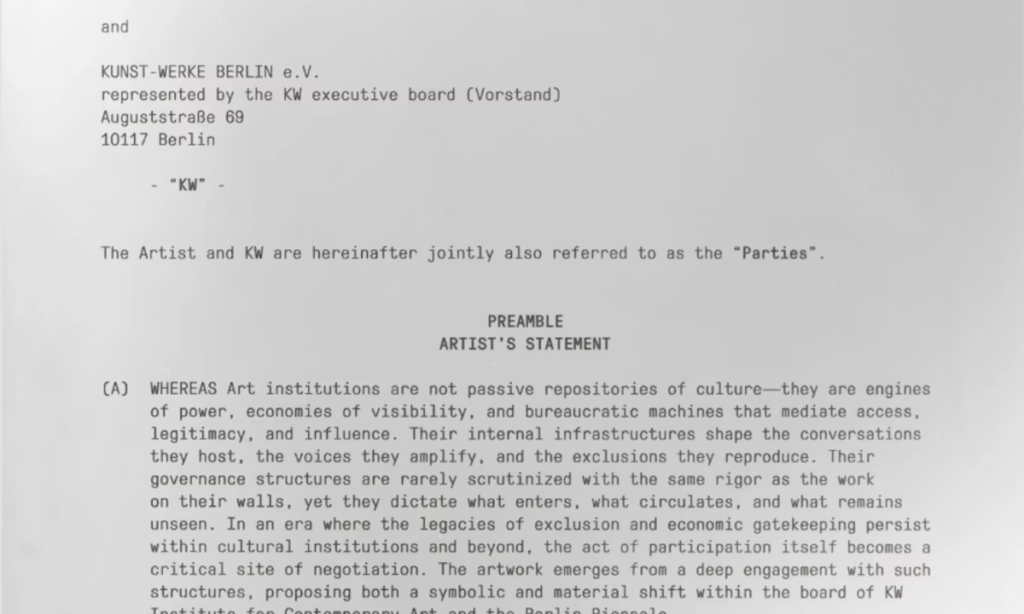 The contract states how the piece’s sale would leverage funds from the private art market to diversify KW’s board, declaring that “institutions evolve not through declarations of inclusivity but through shifts in infrastructure”.