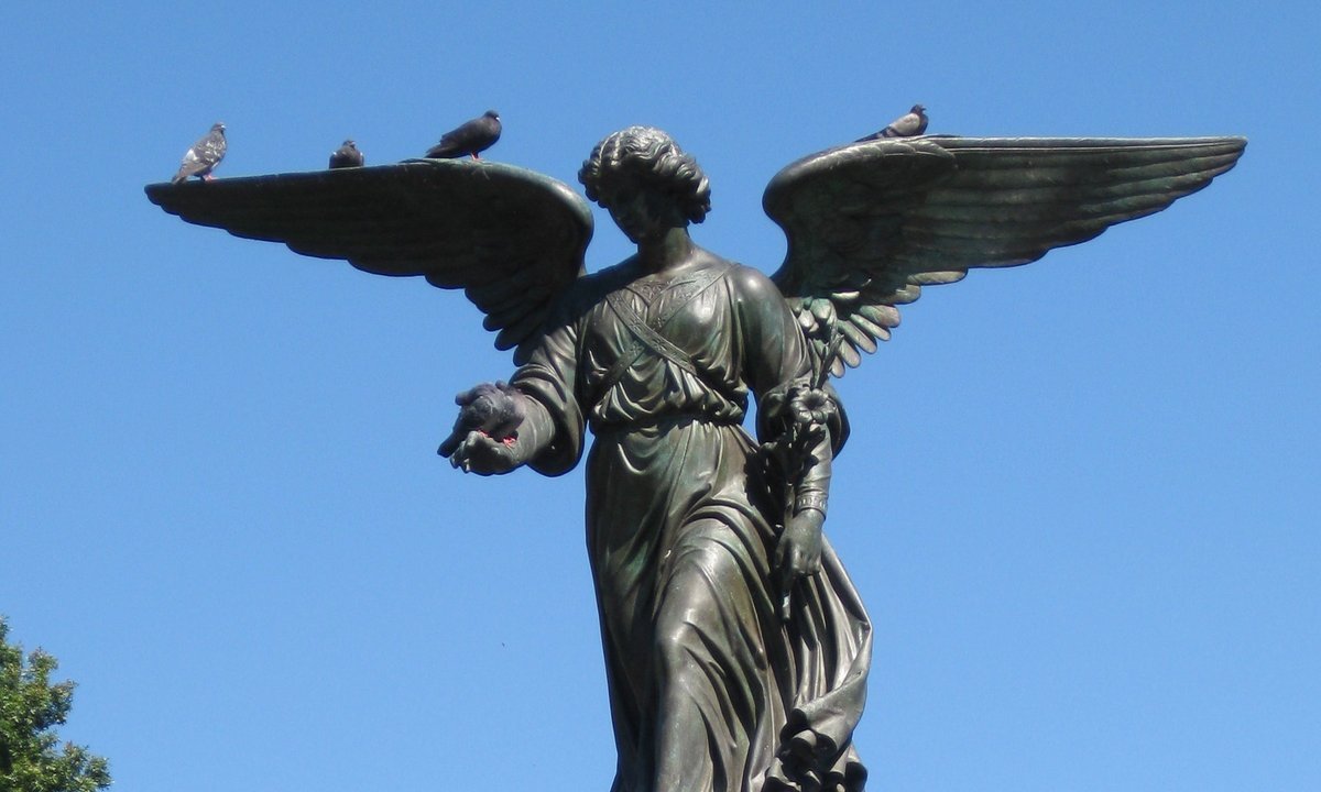 “Artists almost always depict the wings of angels,” the playwright Tony Kushner writes in the exhibition catalogue for Carving Out History, “with the leading edge of the wing and primary feathers pointing vertically. The wings of Stebbins’s angel [on the Bethesda Fountain] are horizontal. They lead the eye not upwards but outwards, not heavenwards but level with our earthbound surroundings. These wings are not annunciatory or admonitory exclamation marks, telling us to drop to our knees before a sovereign power. The Bethesda angel’s horizontal wings gesture laterally towards expanded vision; they’re a welcoming embrace.”