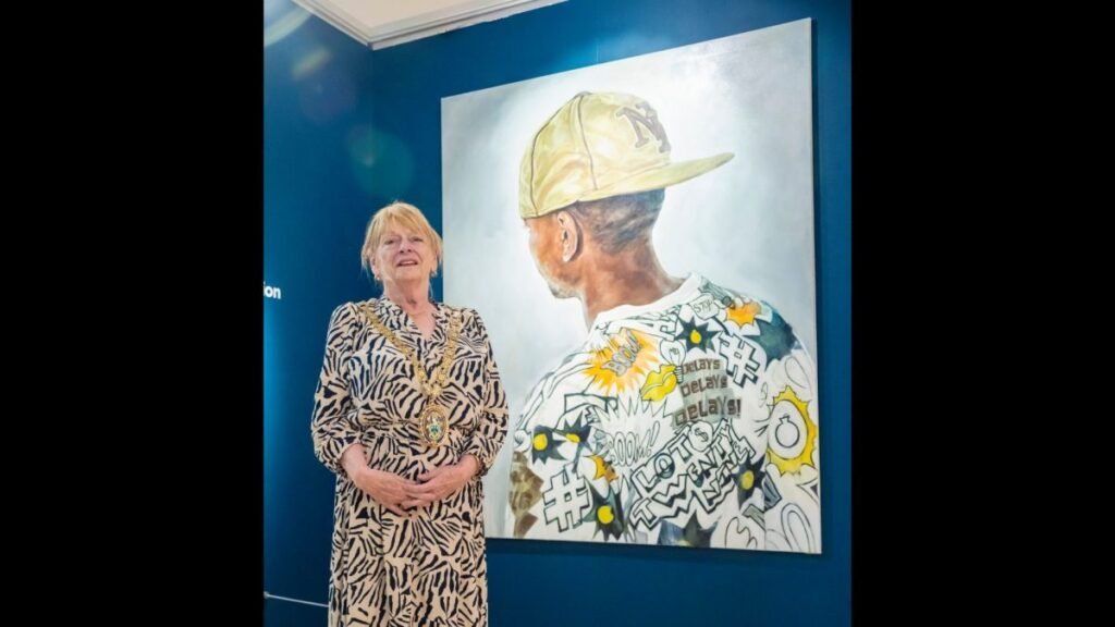 Construct 2, an oil painting depicting a Black male, seen from behind, wearing a graphic t-shirt and backwards-turned baseball cap, was unveiled on Saturday (June 21) by Mayor Barbara Brown, at Rugby Art Gallery and Museum’s Big Birthday Bash.