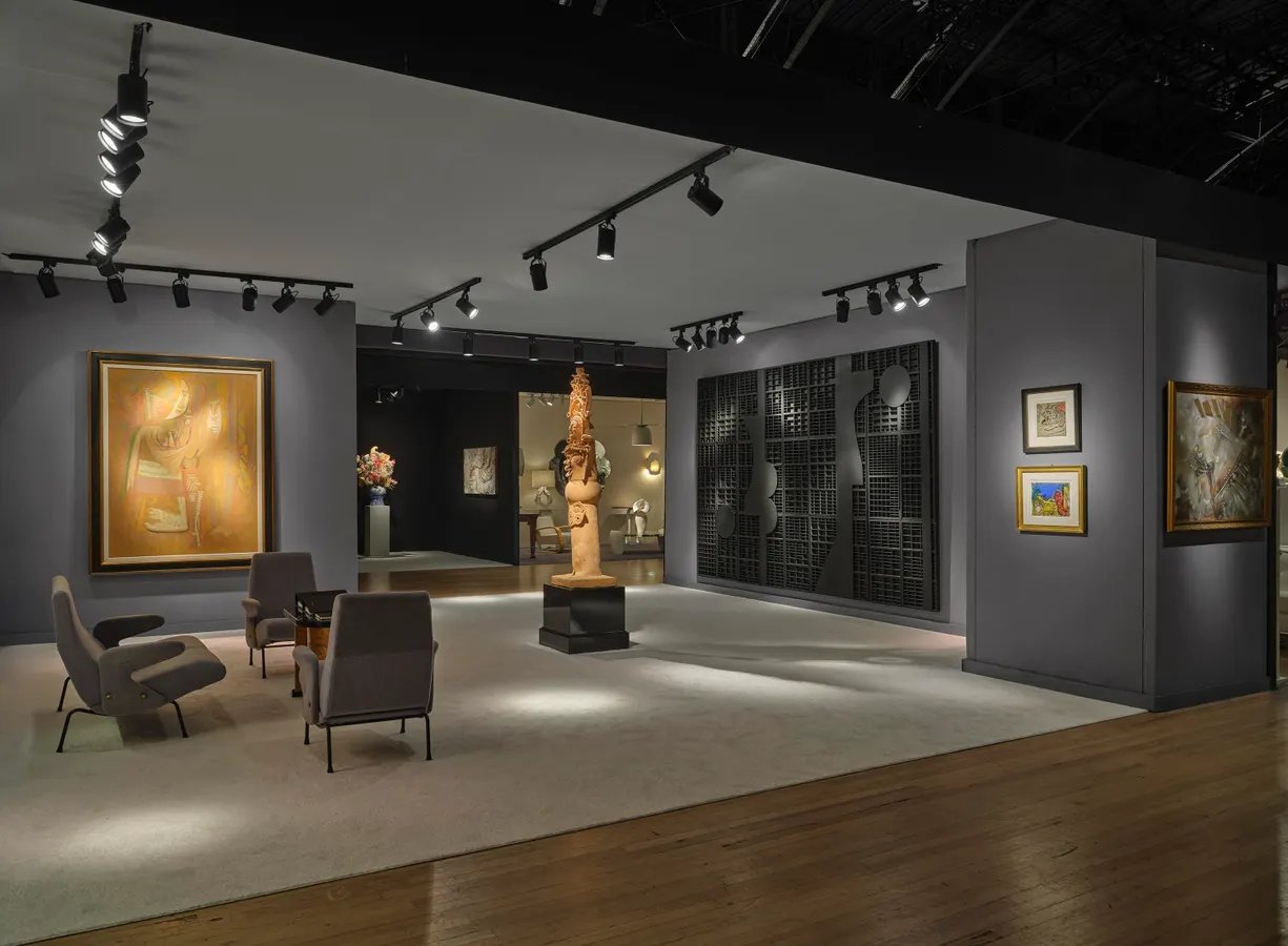 The expansive booth also features three collages by Nevelson using paper, paint, wood, and cardboard which underscore that relationship between fine art and design. Another focus of Galerie Gmurzynska’s booth is an array of paintings by Wifredo Lam, who is being showcased at When I Don’t Sleep, I Dream, on view at MoMA through April 11, 2026. As the representative of the artist’s estate, Galerie Gmurzynska is a key institutional supporter of the MoMA exhibition and has been working with the museum to promote his legacy. Cuba-born Lam advanced the Modernist tradition by introducing an urgent dialogue for Black diasporic culture, asserting that his art was an “act of decolonization.”
