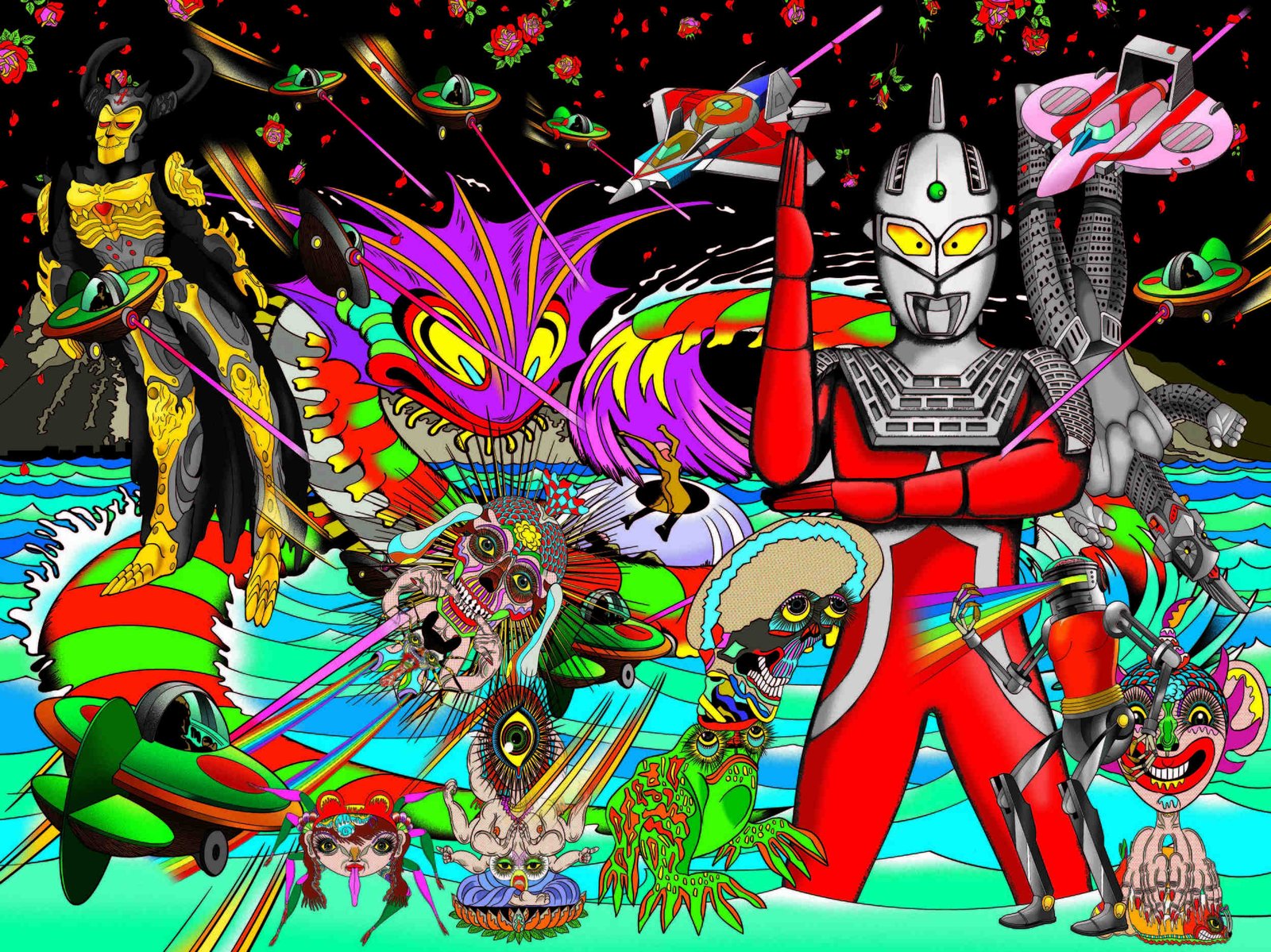 In the first gallery, visitors will find artists who have been consistently engaging with anime and Japanese pop culture, including a work from Yoshitaka Amano, one of the original animators of Speed Racer and a character designer for Final Fantasy. There’s also work by influential Japanese pop artist Keiichi Tanaami, who paved the way for artists like Takashi Murakami, and Rozeal., an African American woman who has been referencing anime and Japanese woodblock prints in her work for two decades.