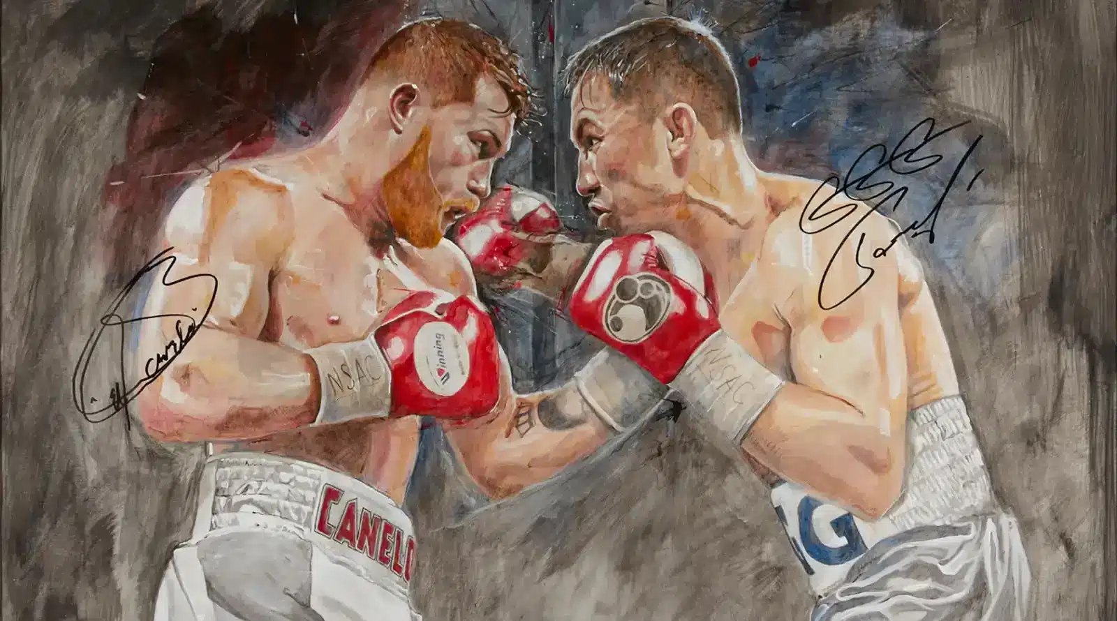 A highlight for UK boxing fans will be the original painting of the second fight between Canelo Álvarez and Gennady Golovkin (2018), created by renowned British artist Richard T. Slone. The work is especially significant as it became the first painted Boxing News cover in the magazine’s long history, marking a milestone in the visual culture of the sport.