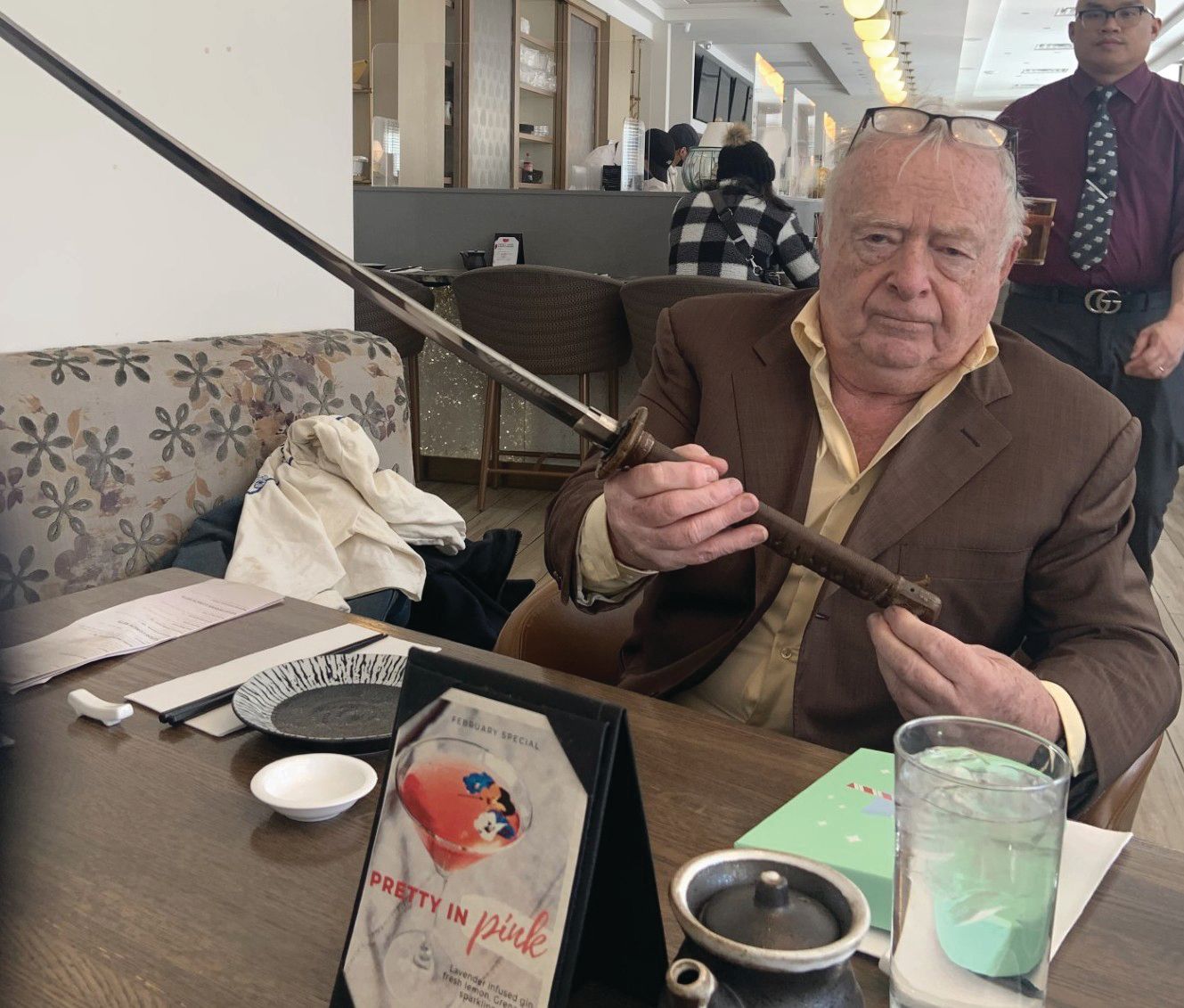 Connor holding one of his newly acquired swords during a lunch with Amore Photo courtesy of Anthony Amore